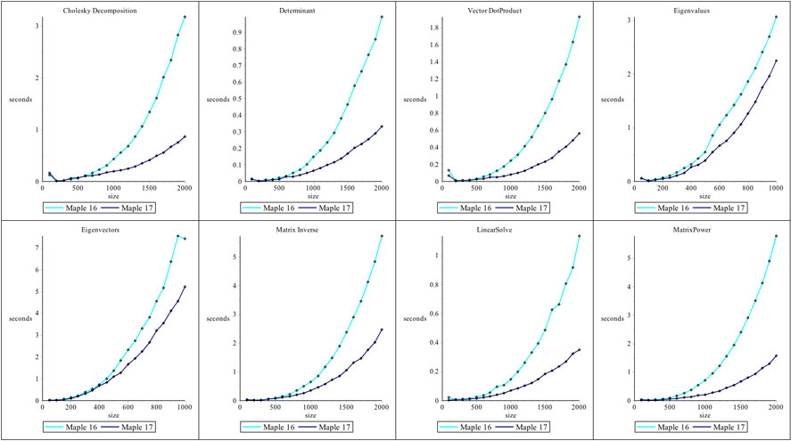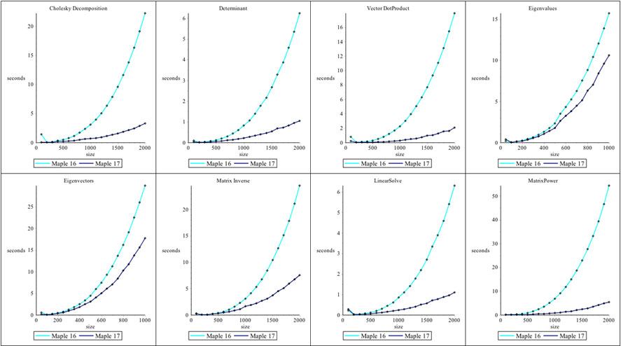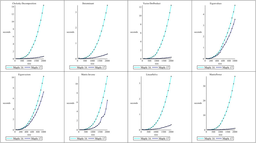 The access to optimized BLAS and LAPACK functions for floating-point Matrices and Vectors has been updated in Maple 17.On Linux and OS X, this involves updates to the ATLAS (Automatically Tuned Linear Algebra Software) dynamic libraries which are shipped with Maple. While on 64-bit Windows, Maple 17 has been updated to use Intel's Math Kernel Library (MKL). Performance enhancements for floating-point Linear Algebra operations include improved use of multiple cores and CPUs.The operations referenced in the plots in this document were all performed on real, floating-point Matrices and Vectors created with the datatype=float[8] option.