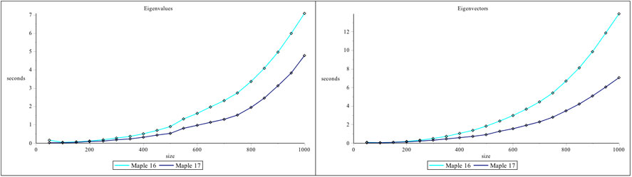 The timing data is given in matrix form below. Mathematica® 9 is the first row, Maple 16 is the middle row, and Maple 17 is the last row.