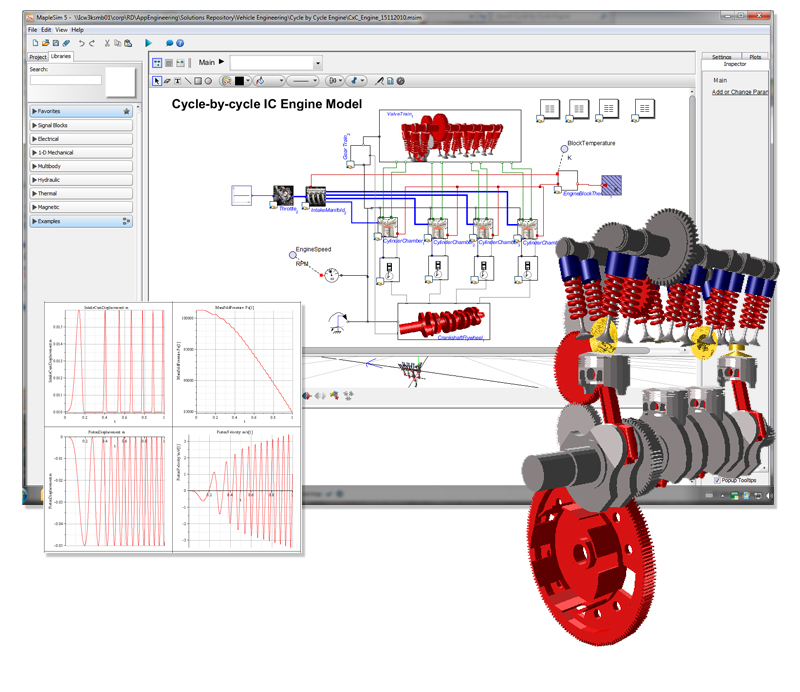 This internal combustion engine model includes mechanical and thermal components, gas flow, and combustion chamber. Time-based modeling allows for high fidelity without the need for crank-based equation derivations. This multidomain model can be easily customized to meet individual requirements.