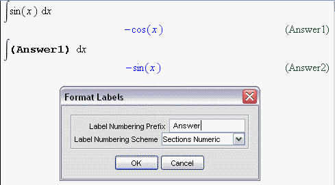 Equation labeling allows you to reference Maple output in math or text areas of your worksheet. The label is associated with the last output within an execution group and with all of the input in the execution group. (See Join Execution Groups).