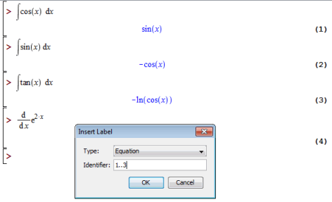 Enter an expression and press Enter. Note that the equation label is displayed to the right of the answer in the worksheet.