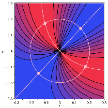 and by studying its behavior for x,y → 0,0. We start by examining f on small circles in the x,y-plane about the origin. Their radius shall be denoted by r and we will later let r → 0. Fig.1 shows a contour plot of f__. Hover over the plot to see its values in the different regions. Furthermore, a circle is drawn about the origin. The solid circles and squares indicate the positions of minima and maxima, respectively, of f__ along the circle. Using the slider you can increase and decrease the radius of the circle and thus track the position of these points. By checking the "Show curves of minima and maxima" checkbox the plot displays the paths connecting these minima and maxima. Clicking on "Play" will animate the process r → 0.