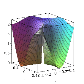 Thus the bivariate limit of this function does not exist, but the function approaches values in the interval 0..2 at the origin depending on the path. You may verify this result visually by plotting the function as a three-dimensional surface plot: