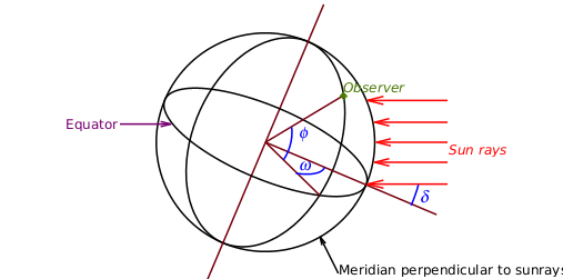Local Hour Angle,   : The angle between the observer's and the sun's geographical position's meridian
