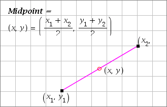 The midpoint of a line segment is obtained by averaging the x-coordinates and averaging the y-coordinates of the endpoints of the segment. If we denote the segment endpoints by x1,y1 and x2,y2, and the segment's midpoint by x,y then we have: