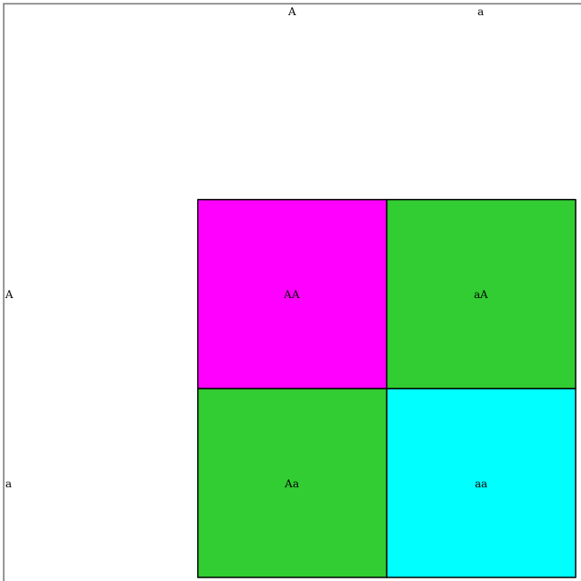 A common Punnett square is a monohybrid cross (Adjust the slider to 1 in the activity below). This type of cross tracks one gene. Both parents are heterozygous (that is, they both have one dominant, A, and one recessive, a, allele for the trait). From the Punnett square, the following conclusions can be made: