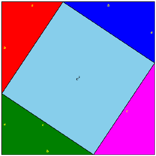 Observe the following animation. The area of the light blue region is c2 at the beginning and a2+b2 at the end, and yet it clearly has not changed.
