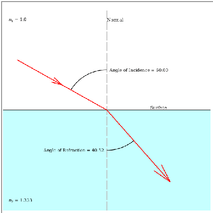 Snell's Law, also known as the Law of Refraction, is a formula describing the relationship between the angles of incidence and refraction when light (or other electromagnetic radiation) passes between two media: