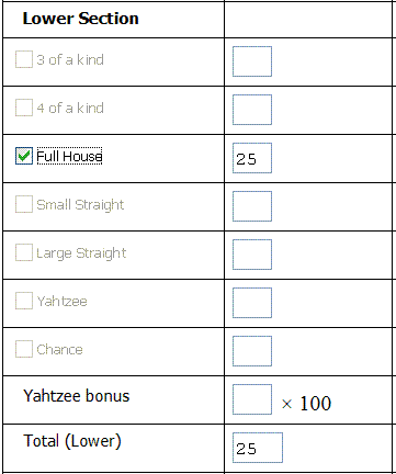 The lower section is vastly different to the upper section in that it contains a number of poker-themed combinations. These are: 3 of a Kind, 4 of a Kind, Full House, Small Straight, Large Straight, Yahtzee, and Chance. The table below provides more information on each combination on the score allotted.