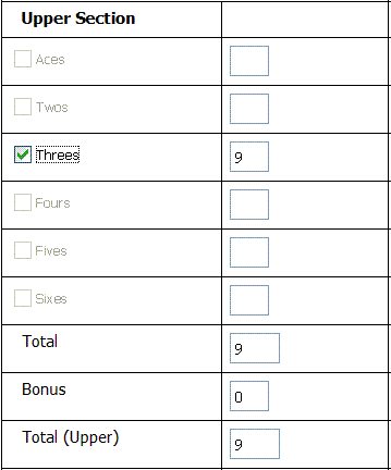 If you choose to score your roll in the upper section of the scorecard, your score is recorded as the sum of all dice in the score category chosen. For instance, a roll of 3-1-3-5-3 scored in the Threes category would result in a total of 3+3+3=9 points. A Bonus score of 35 points is added if a player scores more than 63 points in the upper section.