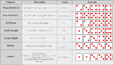 Yahtzee is a dice game that is loosely based on the Puerto Rican dice game Generala, and the English games of Poker Dice and Cheerio. The object of the game is to score the most points by throwing 5 dice. A game of Yahtzee consists of 13 rounds. A player is allowed to roll the dice three times in each round. Each roll will be scored in one of 13 scoring categories based on the combination of dice rolled.