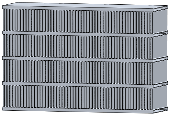 We can create a CAD rendering of our smaller radiator assembly. The design parameters of our new design are the same as the original, except it is smaller in length and has more fins per row.