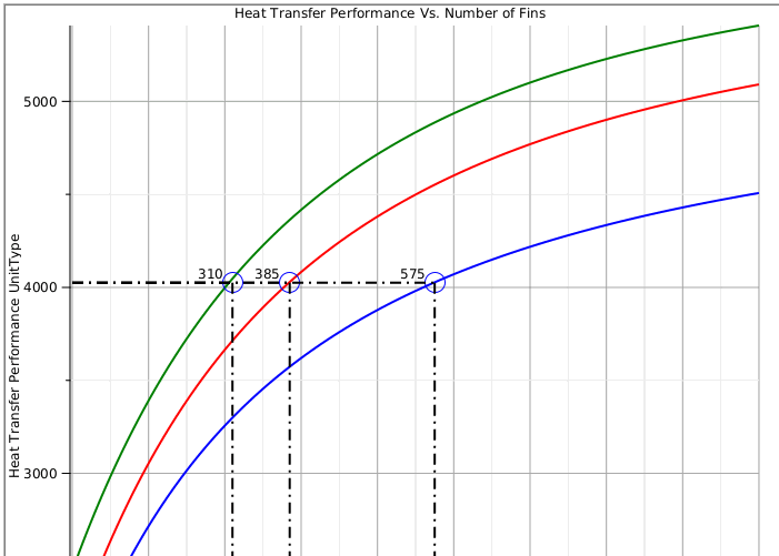 Thus, the number of fins per row must be increased from 384 to 437 to achieve a heat transfer performance of 4025 Btuminute ≈70729.3 Js. The graph in Figure 6 shows the effects of changing the number of fins per row on the heat transfer performance for our smaller radiator design.