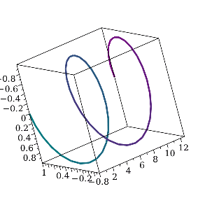 plots:-spacecurve cost, sint, t, t=0..4⋅Pi, thickness=5, colorscheme=Teal, Purple