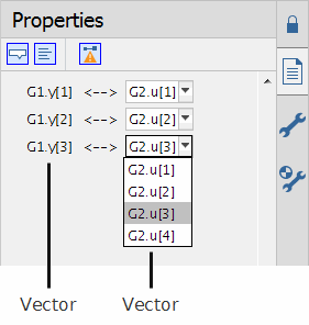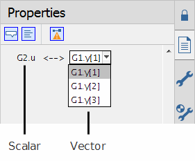 The Connections Manager is found under the Properties tab ( ) whenever you select a connection in the Model Workspace. The following figure shows a connection between a scalar port and a vector port. Scalar ports are always on the left. The list on the right lets you choose what quantity from the vector port to connect to the scalar.