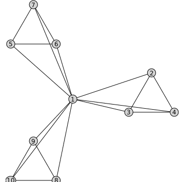 WindmillGraph(k,n) creates a windmill graph with n*(k-1)+1 vertices and n*k*(k-1)/2 edges. This consists of n copies of the complete graph on k vertices which are joined at a shared universal vertex.
