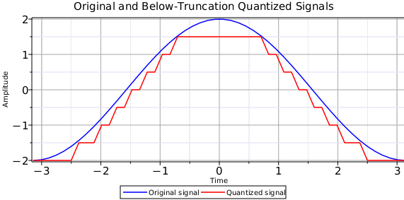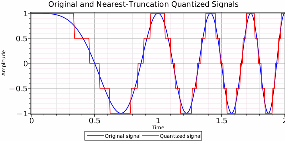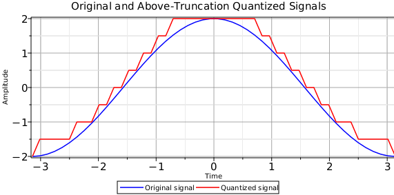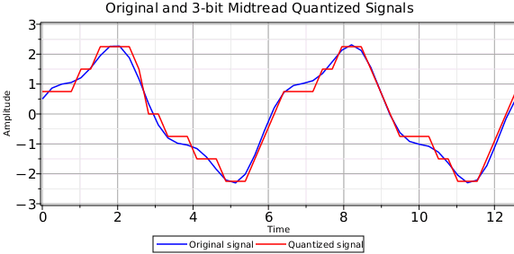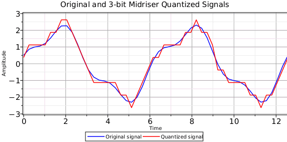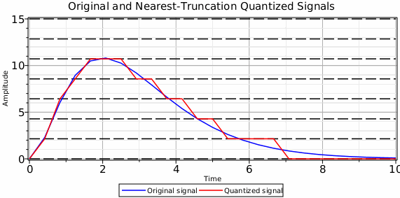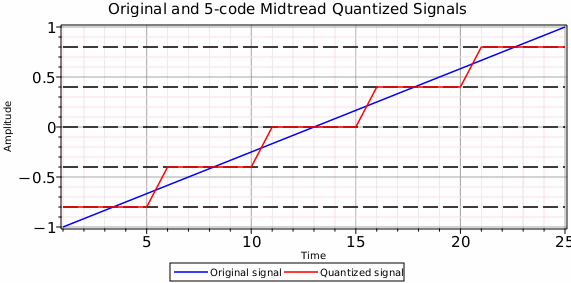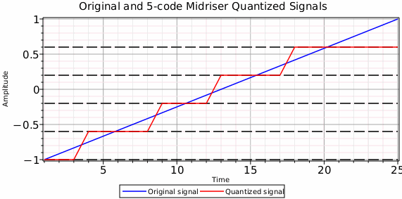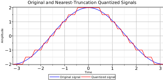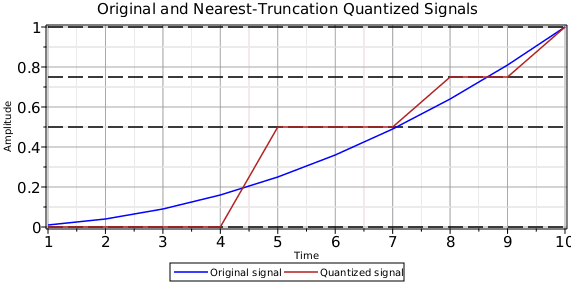 Quantize⁡X,C,truncation=nearest,output=plot,originalsignalplotoptions=color=blue,quantizedsignalplotoptions=color=firebrick,emphasizecodes