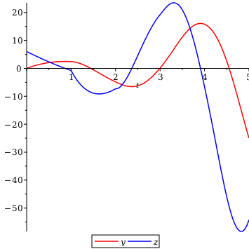 plots[odeplot](dsn, [[t, y(t), color = red], [t, z(t), color = blue]], 0 .. 5, legend = [y, z], labels = [t,""] );
