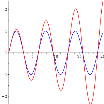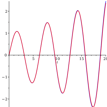 plots[odeplot](dsn, [[t, x__1(t), color = blue], [t, x__2(t), color = red]], 0 .. 20, labels = [t, ""]);