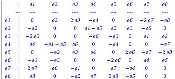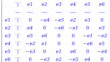 so22data ≔ e1,e2=−e4,e1,e3=−e5,e1,e4=e2,e1,e5=e3,e2,e3=e6,e2,e4=e1,e2,e6=e3,e3,e5=e1,e3,e6=−e2,e4,e5=e6,e4,e6=e5,e5,e6=−e4