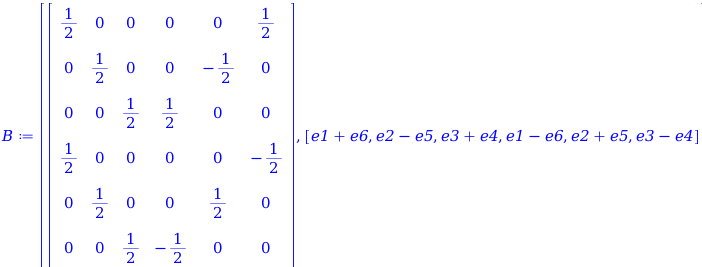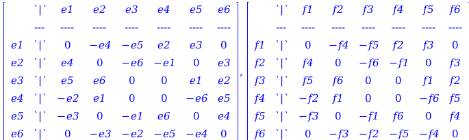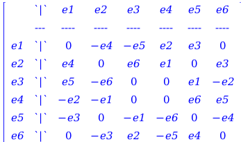 so4data ≔ e1,e2=−e4,e1,e3=−e5,e1,e4=e2,e1,e5=e3,e2,e3=−e6,e2,e4=−e1,e2,e6=e3,e3,e5=−e1,e3,e6=−e2,e4,e5=−e6,e4,e6=e5,e5,e6=−e4