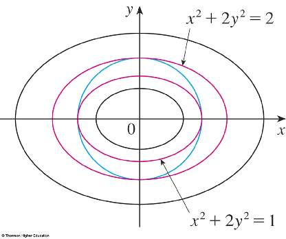 Rote la figura de arriba de tal forma que el eje apunte directamente hacia usted (Sugerencia: Utilice ) Rote ahora la figura y note nuevamente la posición de los extremos relativos y su relación con las curvas de nivel con las que la elipse es tangente en la figura. ¿Cómo puede, a partir de la información de la figura de arriba, determinar el valor de para las curvas de nivel que son tangentes a la elipse de restricción? Sugerencia: Fije las condiciones . Para la curva de nivel en la posición superior izquierda que es tangente a la elipse, note que ella corta al eje vertical en el punto ¿Cuánto vale ? Repita el procedimiento para las otras tres curvas de nivel tangente a la elipse y verifique su resultado rotando la figura de arriba para observar el valor de en esos puntos.