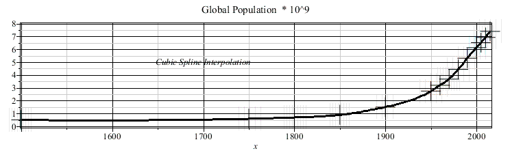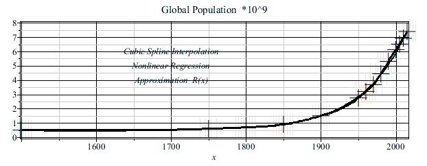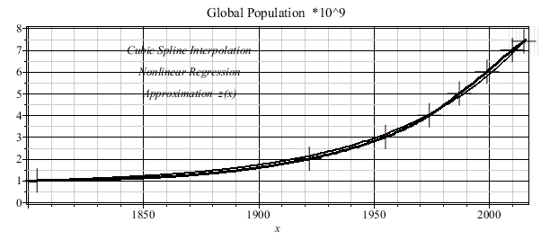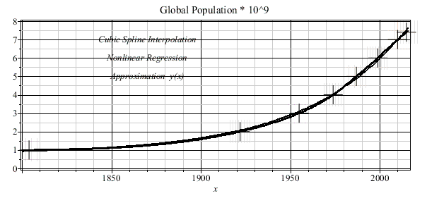 This worsheet is concerned with the development of the global population during the period of 1804 - 2015. In 1804 or 2015 the population is 10^9 or 7.4*10^9, respectively. The given data has been interpolated by the cubic spline function.