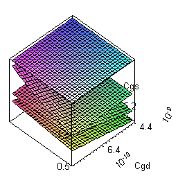 Now we can examine the effect of gate-drain capacitance, Cgd, on the value of the gate voltage Vga by plotting Vga as a function of both time and Cgd and keeping the remaining variables at a constant value.