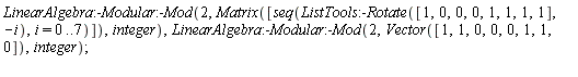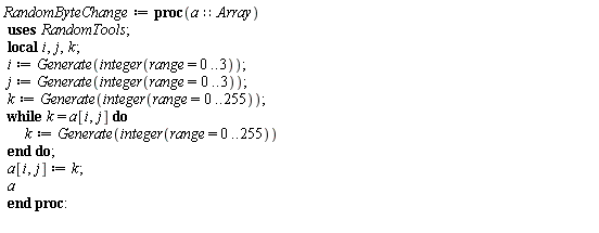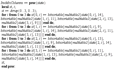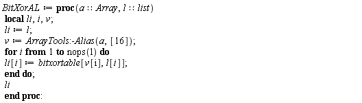 We will also use the following version of BitXor, which computes the BitXor of a 0..3,0..3 Array a with a list l of no more than 16 terms, where the array is passed as the first argument and the list as the second. If n is the the length of l, then the output is the list of length n obtained by BitXor-ing the elements of l with the first n elements of a with respect to Fortran_order . The function ArrayTools:-Alias is used here to view the 2-dimensional Array as a 1-dimensional Array with this order.