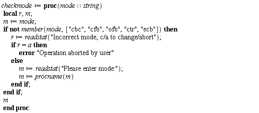 When calling the preceding functions from higher level encryption/decryption functions, we will use the following procedure to check if the supplied mode name is correct. Valid modes are