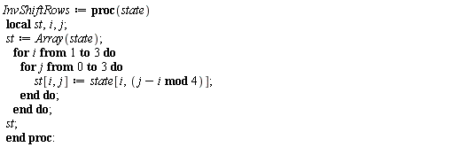 The ShiftRows operation consists in shifting the rows of the state Array by 0, 1, 2, 3 positions to the left, i.e., each row is shifted by the same amount as its index. The inverse operation just shifts rows right by the same offsets. These operations are not implemented "in place" as we need to use a copy of the state Array inside the corresponding function.