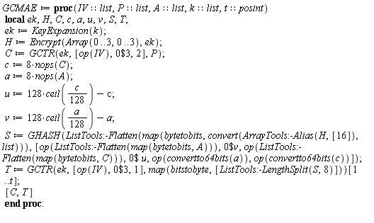 Next we provide the high level CCM Encryption/Decryption functions. Here one has to control the various bounds and limits imposed by the standard. For example, the MAC size and the nonce size can only take a few possible values. These values can be passed to the functions by means of keyword parameters: t specifies the MAC size in bytes, while n specifies the byte length of the nonce. As default values we have adopted 16 for the MAC size (this gives the greatest security; sizes below 8 are not recommended) and 11 for the nonce size. The latter allows a large number of nonces while, at the same time, allowing payloads of up to 2 bytes, which are significantly larger than what one can handle with this implementation (the nonce size-payload size tradeoff inherent to the standard means that the byte length of the payload is below 2). The standard also specifies a limit on the size of the associated data, which should be less than 2 bytes long. This limit is enforced in the generation-encryption function below following NIST's recommendation but in practice a lower limit (also for the associated data string) is imposed by Maple's maximum list size. Other optional parameters in the next function are the one that specifies the message type, which can be either file, hex or text. The first tells the encryption function that the string passed to it as the payload argument is the name of a file, hex means that the payload is a hex string and text means that the payload is ordinary text (a different conversion to a list of bytes is applied in these two cases). The default message type is file. The remaining optional parameters, given also as keyword parameters, are the file name (which is only needed when the message type is file) to which the resulting ciphertext is going to be written and the filecheck parameter which specifies if a check for a file with the given name should be done before writing to disk (to avoid inadvertently overwriting an existing file with the same name). filename has a default which consists in appending the string ".ccm" to the name of the file being processed and the filecheck parameter has true as default value. The false value for this parameter is useful mainly for testing purposes.