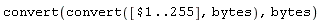 Now, to write a list of bytes to a file we have to convert bytes (integers in the 0..255 range) to integers of type integer[1]. One would like to use the function mods(-, 256) but this function does not convert the 0..255 range to the -128..127 range but to the -127..128 range instead. This problem is easily solved as, if one applies mods(-,256) one only needs to take care of converting the 128 byte to -128 instead of keeping its original value. We will do it by using a slight modification of this function, namely the function x -> mods(x+1,256)-1. In order to speed this process up, we build a table to convert bytes to integers in the integer[1] range: