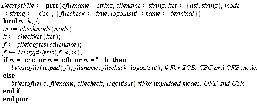 Finally, a few remarks about function naming and type checking. In general, we have tried to use meaningful names for the functions we define. These names tend to be long but they are easier to remember and to identify than shorter names. In the case of lower level procedures that are intended to be called from other functions and not directly by the user, we often use lower case letters only. For functions that are to be called by the user or that have a definite cryptographic meaning we frequently use a concatenation of the words that describe the function with the initial letter of each word in upper case. Also, to allow for more compact code when calling functions from Maple packages, one could use the with command in the Initialization section to make the short names of these functions available. However, there are some cases in which two of the packages we use export the same name (for example, LengthSplit, Reverse and Rotate are common to both ListTools and StringTools, Generate is common to StringTools and RandomTools, Random is common to StringTools and LinearAlgebra:-Modular ...). We could still use the short form of these names in many situations but this would require keeping track of the order in which the names of the different packages were exported, creating a potential source of confusion. To prevent this and also to make the code usable in different contexts without further modification, we have decided to use the long function names even in case these names are not repeated in different packages. Regarding type checking, it is minimal or even non-existent in low level functions but we have tried to make extensive use of it in the higher level ones. Also, for many of high level functions and for the convenience of the user, we have provided default values for some of the parameters, whenever it makes sense.