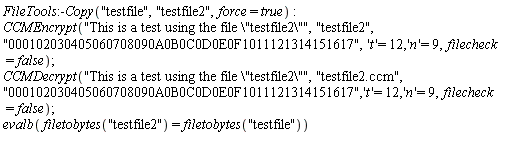 Another quick test of these functions, using the file "testfile" is the following one. First we copy this file to a file named "testfile2". Then we apply the encryption-verification function to this file producing a file named "testfile2.ccm". Then we apply the decryption-verification function to this file and the output should be a new version of "testfile2" that should be equal to the original one, which can be checked by comparing it with "testfile".
