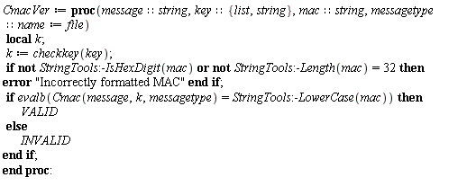 The verification function GmacVer is given next. The input parameters are the same as those of Gmac with the addition of the MAC (as a hex string) and without the tag length which can be deduced from it. The output is either VALID if the MAC corresponds to the message under the given key or INVALID otherwise.