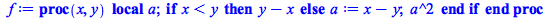| > | f := proc(x,y) local a; if x < y then y-x else a := x-y; a^2 end if end proc; |