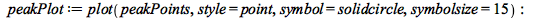 > peakPlot := plot(peakPoints, style = point, symbol = solidcircle, symbolsize = 15); -1plots:-display(peakPlot, violinPeriodogram, view = [1 .. 10000, default], size = [800, 300])