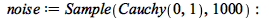 In this example, we have 1000 data points. There is a single independent variable, x, with values uniformly distributed between 0 and 10. The dependent variable is a linear function of the independent variable plus some additive noise, y=5 x + 10 + noise, where the noise is from a probability distribution known to have severe outliers - the Cauchy distribution, with location parameter 0 and scale parameter 5.