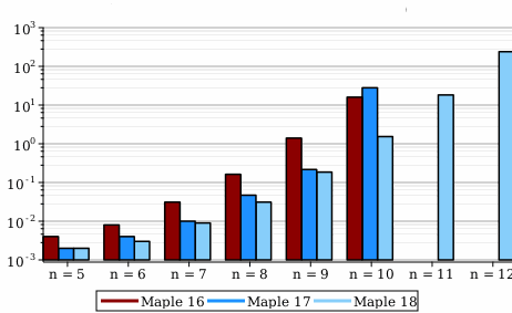 The benchmark was performed on an Intel Core i7 3930K 3.2 GHz with 64 GB RAM running 64-bit Linux. Maple 16 uses the traditional "sum of products" data structure for all polynomials. Maple 17 uses the new polynomial data structure for determinants up to n=9, but for n=10 the total degree field overflows and performance degrades. The extra degree bits in Maple 18 allow the computation to reach n=12,which produces 479 million terms.