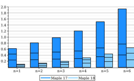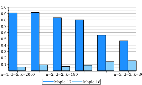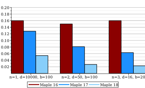 Maple 18 builds upon the efficiency improvements of earlier releases for multivariate polynomial operations. More polynomials now take advantage of the high performance data structure introduced in Maple 17, further improvements has been made to Maple’s performance for large computations, and polynomial computations modulo p are now significantly faster. As a result of these changes, computations that explicitly rely on polynomials, as well as the many Maple library routines that rely on underlying polynomial computations, are now faster.