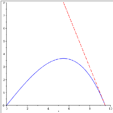 cv := NewCanvas([ "Sample Problem", "A rocket follows a path given by:", y=x-1/90*x^3, Text("If the horizontal velocity is given by %1",v[x]=x), "Find the magnitude and direction of the velocity when the rocket hits the ground (assume level terrain) if time is in minutes.", StaticPlot( plot([x-1/90*x^3,-2*x+6*sqrt(10)], color=[blue,red], linestyle=[solid,dash],view=[0..10,0..8]) ) ]):