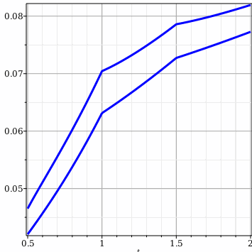 plotsdisplay⁡plot⁡ForwardRate⁡R,0.1,t,t=0.5..2,color=blue,thickness=3,plot⁡ForwardRate⁡R,0.3,t,t=0.5..2,color=blue,thickness=3,axes=BOXED,gridlines=true