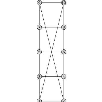 The Möbius ladder graph on 2n vertices is similar to the ladder graph with two additional edges, between vertices 1 and 2n and vertices 2 and 2n-1. These edges join the ends of the ladder to form a Möbius strip. It is named after August Ferdinand Möbius.