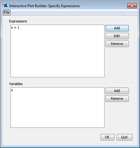First, launch the Plot Builder from the Tools>Assistants menu. In the Expressions section, click the Add button, and enter x=1.