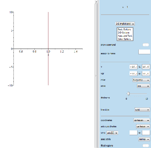 Figures 1 - 3 all require some mathematical insight on the part of the user, who must correspondingly implement some appropriate Maple construct that reflects that view of the vertical line.  Now what happens when the user naively tries to plot x=1 interactively via the Context Panel?  Select the equation x=1 and from the context-sensitive operations in the Context Panel, select Plots>2-D Implicit Plot>x,?.