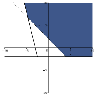 Use the drop down lists to choose a linear equation, and choose whether to set it greater than, greater than or equal to, less than or less than or equal to 0. Use the checkboxes to choose which inequalities to use. The solution plotted on the right represents all points x&comma;y that satisfy all the inequalities you have chosen.