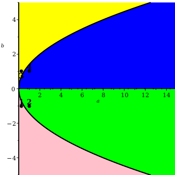 m≔Equations=⁢x2+y2−a,x−y−bInequalities=⁢aFilter=⁢0≠1Variables=⁢x,yParameters=⁢a,bDiscriminantVariety=⁢a,−b2+2⁢aProjectionPolynomials=⁢b,a,−b2+2⁢aSamplePoints=⁢a=3022314549036572936765311208925819614629174706176,b=−1,a=1,b=−1,a=3022314549036572936765311208925819614629174706176,b=1,a=1,b=1