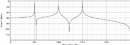 Clearly, the signal is dominated by the frequencies 500, 1000, and 1500. To confirm this, we can use MeanFrequency in bands around these values: