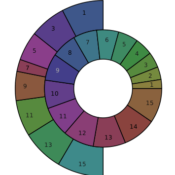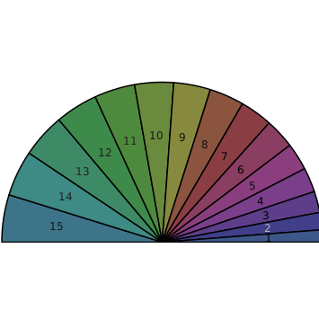 If the full pie is selected (by omitting the sector option, or by explicitly selecting sector = 0 .. 360), then the colors of the slices will be assigned so that they are continuous along the full pie: one slice will have the first specified color, then subsequent colors in the range are assigned alternatingly to the next uncolored slice counterclockwise and the next uncolored slice clockwise, continuing until the last slice gets the second specified color.